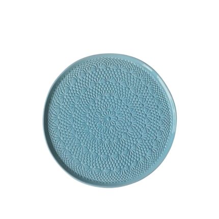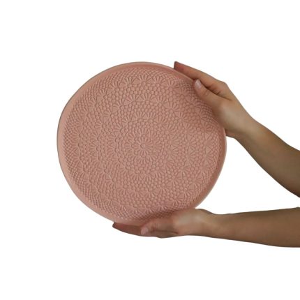 Sirva momentos doces com uma peça que conta histórias. Este prato artesanal em cerâmica apresenta um detalhe minucioso que replica a textura do croché tradicional, unindo a elegância da mesa posta ao calor das memórias de família. Com 27 cm de diâmetro, é a base perfeita para elevar as suas criações de pastelaria a um novo patamar de sofisticação.
