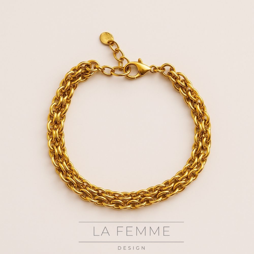 “O segredo de um look sofisticado está na harmonia dos metais. A Dica La Femme é criar um conjunto impecável combinando esta pulseira com o nosso Colar Gold Chain Lovers; a continuidade dos elos cria uma linha visual que alonga e ilumina a silhueta. Para um ritual de beleza que acompanhe este brilho, utilize o nosso Sabonete de Argila Branca para manter a pele dos pulsos e mãos radiante e purificada. E se o seu dia pede um toque de arte, deixe que esta pulseira seja a sua companhia enquanto degusta um café na nossa Chávena Honey; o dourado da joia e o tom mel do grés formam uma paleta digna de um editorial de moda.”